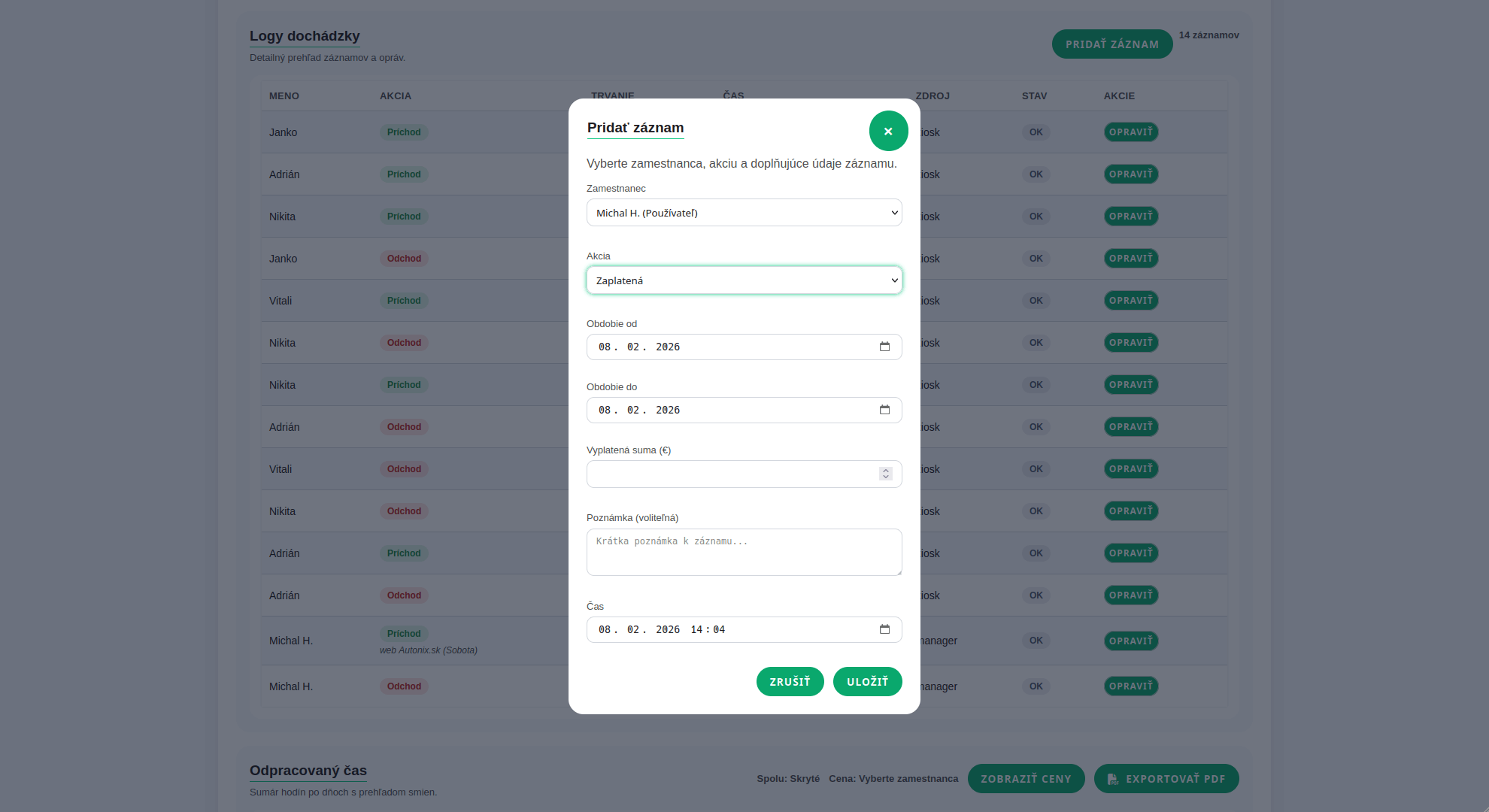 Evidencia príchodov a odchodov zamestnancov